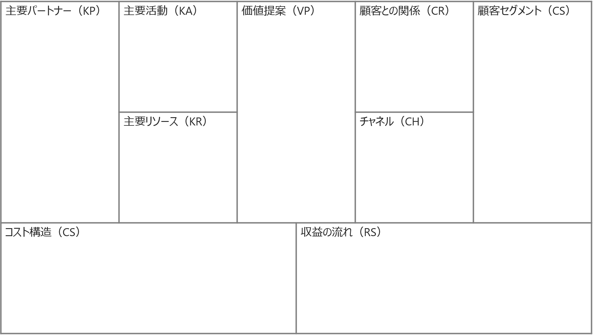 - CS(コスト構造、Cost Structure):固定費、変動費(活動費やリソース調達・維持、パートナー)
